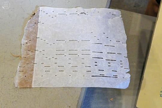 A sample of music roll, illustrating some of the notations and how thin the paper actually is – photo by E. Jurus, all rights reserved