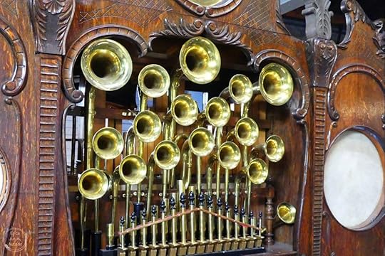The air comes from bellows that pump it in compressed form into the wind chest, which itself contains a series of valves (pallets) connected to either a keyboard (in a regular organ) or to the device which reads the punches on a music roll in player pianos and organs. On band organs, a wheel at the back of the organ turns a crankshaft that operates the pump stick driving the bellows. Many people call a band organ’s music “the happiest music on earth.”