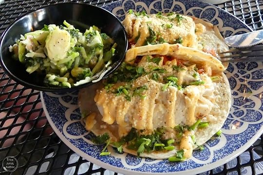 Fish tacos and coleslaw at the Ellicottville Brewing Co. restaurant in Bemus Pt, NY – photo by E. Jurus, all rights reserved