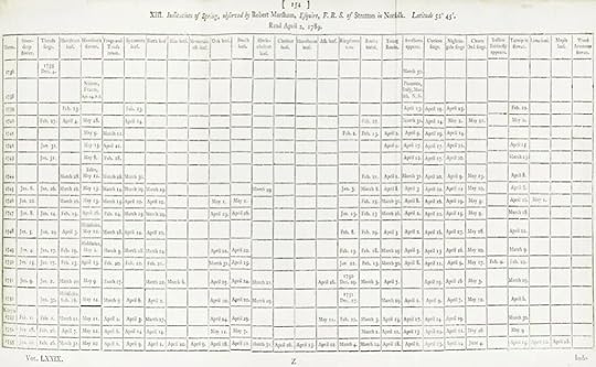 “Records spanning 1736–1755 from “Indications of spring, observed by Robert Marsham, Esquire, F. R. S. of Stratton in Norfolk. Latitude 52° 45’”, originally published in Philosophical Transactions 79 (1789)” (PDR, From Snowdrop to Nightjar – Robert Marsham’s “Indications of Spring” (1789)” — Source: https://royalsocietypublishing.org/doi/10.1098/rstl.1789.0014And regardless of what modern scientists might have thought of the Marsham family’s ‘amateur’ work, the recordings represent the longest such record for the UK, and have provided a lot of valuable material for tracking changes across the centuries, including our own age of global warming.