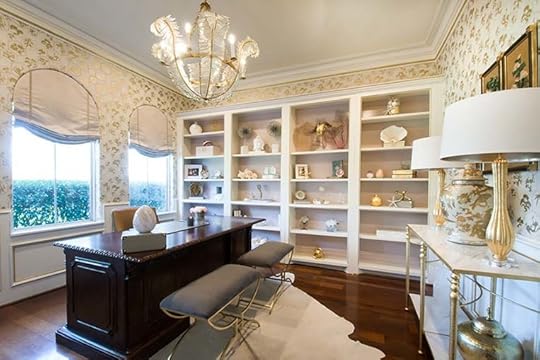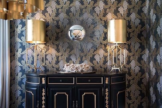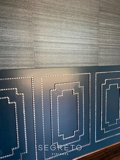 The study off the entrance has interesting wainscoting. To pull in the metallic in the silk wallcovering its details was embellished with a silver paint infused with real metal enhancing the geometric pattern.