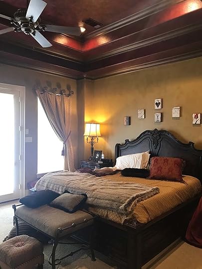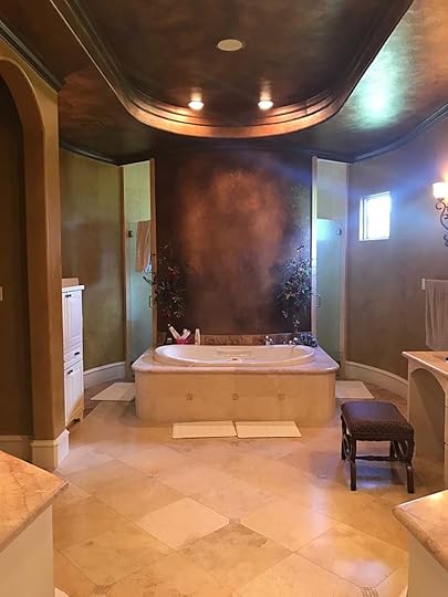 This master bath had so many different angles. Thus, wall covering would have definitely been a challenge to install. Starting with the beautiful scones, a stencil was selected which could be adjusted when hand-painted to wrap around the many angles in the space.