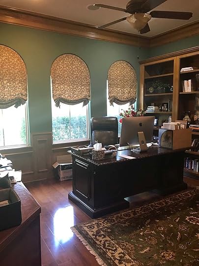 The library is adorned with Pecky Cypress molding, beams and bookcases. It makes for a cozy feeling with the tall drapery and fireplace amidst the wood paneling and coffee table. It looks like the perfect place to cuddle up with a furry friend and read a book! This finish color is still current today, however, it can easily be glazed to read lighter or even like weathered wood that’s been aged to take on a greige appearance.