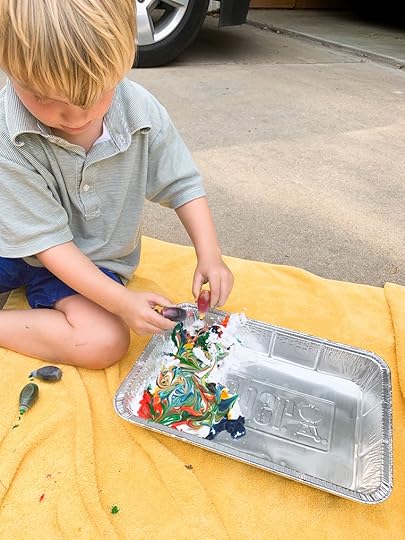 Segreto Designer, Leslie Simmons, has been coming up with all kinds of activities to do with her kids, Carter and Brynn. So Grab your aprons and plastic table clothes and let’s see what they’ve been up to. Marbleized paper was a big hit at her household!