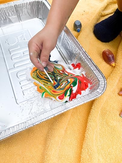 Use your stir stick to create the marbled effect then place your paper on top. Press it into the shaving cream.