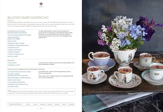 As you know I love setting a beautiful table and the tablescapes are as inspirational as the food is masterful. This tray of Bloody Mary Gazpacho sits in front of a smokey plaster background.