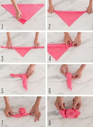 I just couldn’t resist these placements from my pals at Back Row Home, There are two birds kissing in the center of each mat, adding just the right amount of whimsy! The pink napkins were my grandmothers, and their scalloped edges made the most beautiful floral roses. I was so happy that my daughter Kirby was there to help! Even though I followed the tutorial exactly from my Pinterest board- hers were so much prettier!! Notice first one-hers vs. this one-mine!