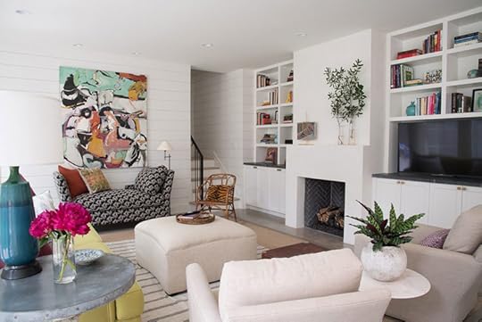 This photo of the same room shows how the simplicity of the plastered fireplace is architecturally important without competing with the large-scaled art! By mixing different textures of the same tone, interest and warmth are established without closing in a space. Love the stylized simple vases filled with greenery!