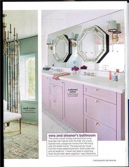 Finally, you can see how Meg captures the personality of the people using it. The rich color scheme, layered with velvets, provides sophistication in the master, while the feminine mystique of the girls’ bathroom is playful and fun. I adore the geometric symmetry in both rooms! The octagonal mirrors and the angled built-in bookshelf add to the charm of each space.