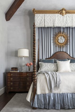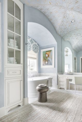 You may recognize this beautiful bath from Segreto Vignettes! First plastered. the ceiling has a hand-applied treatment with hints of gold leafing. This accentuates the beautiful architecture of the ceiling and adds that eclectic element to this otherwise traditional space.