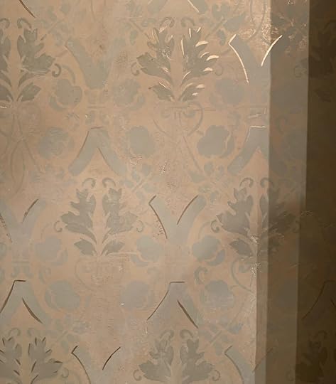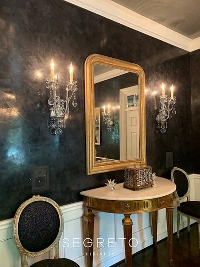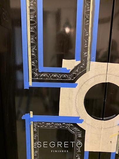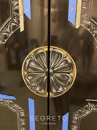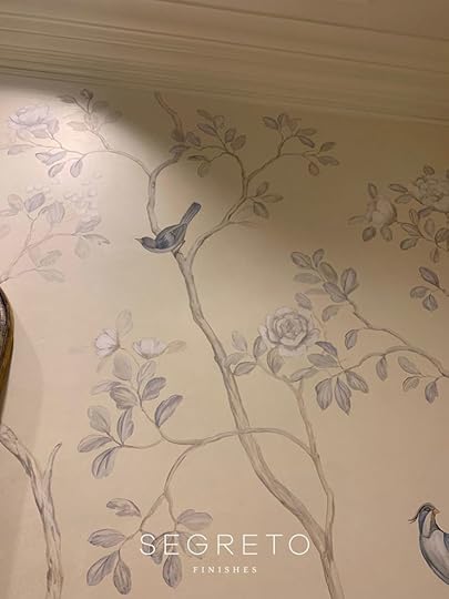 ……I went with a new look. Here we are two days and counting. As the mural evolved, I felt that I made the right choice. The tones are all Segreto Paint colors in different darkness’s of the same tone. The bead detail on the paneling was gold leafed and I glazed a bit of Segreto’s Rosewater on the reveals.