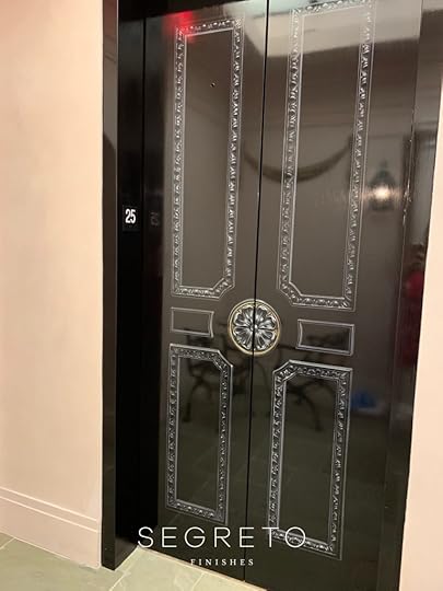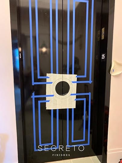We decided to create a medallion in the center of the design rather than exactly creating the doors knob. This was not an easy project as it seemed as soon as we were on a roll painting, someone would come up to the unit and the doors would open mid paint stroke!