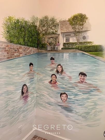 Wanting to see their grandkids more than when they were actually swimming in the pool, we painted their portraits on the walls right outside the pool house’s guest bath. If you look closely you can see the doting grandparents sitting on the porch watching their cherished ones taking a swim.