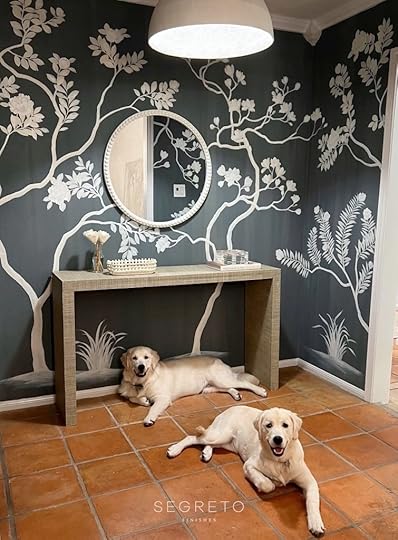 Segreto Finishes Showroom-Hand-painted muralBy taking traditional elements and painting them oversized, the art of the mural has been reinvented to work well in today’s transitional and modern design. I have several similar interpretations in my own home infusing nature and beauty into my own interiors. Never needing water, these elements will give me joy all year long.