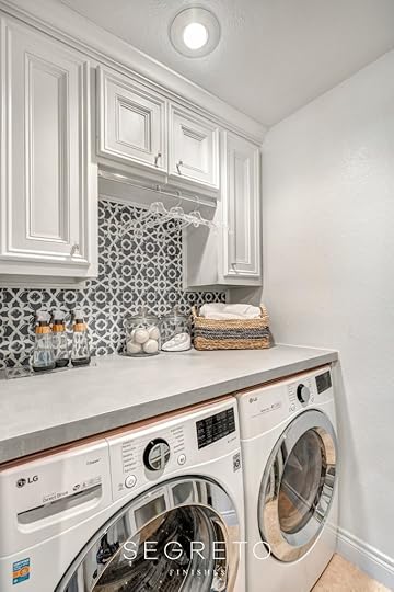 …the bar and bar tile were painted in the main house color of Paloma! Painting tile is an affordable way to change it’s look. We did a little silver leaf detail on the cabinet fronts to dress up the cabinetry and enhance her new hardware from Acero Bella.