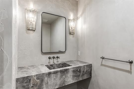 This picturesque powder, with plastered walls and a raised peony plaster design really offsets the floating marble sink and designer sconces.