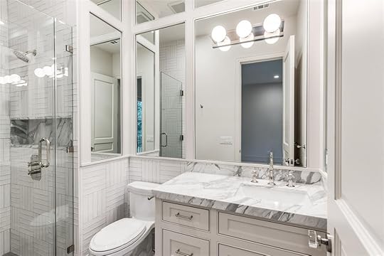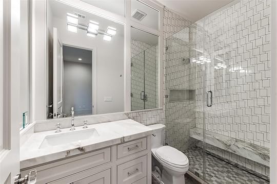 This secondary bath features a beautiful walk in shower enclosed in glass making the bathroom feel light and bright. The tile selection throughout is just fabulous!
