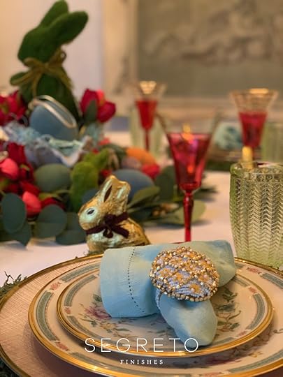 With lots of time at night at home during Christmas and New Years’, I had re-discovered eBay! Wow-what you can find for such reasonable prices especially if you like vintage. I found this retired Lenox Morning Blossom China pattern and fell in love. With so many colors it could fit any style of table décor depending on what it’s mixed with. I also picked up 8 of these Kim Seybert gold beaded Easter egg napkin rings for 30$ plus shipping-close to what two would sell for a retail store. Since, I have seen them with a blue/green flower. They have many to choose from, just search Easter napkin rings.