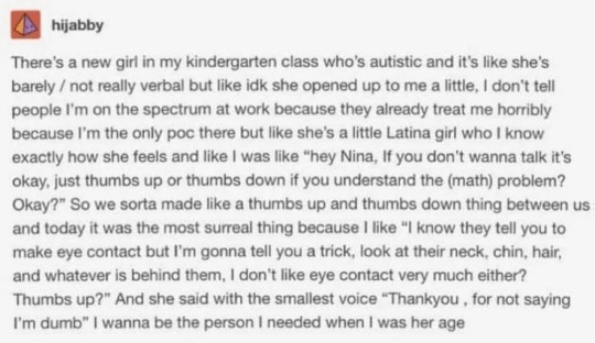 There’s a new girl in my kindergarten class who’s autistic and it’s like she’s barely / not really verbal but like idk she opened up to me a little, I don’t tell people I’m on the spectrum at work because they already treat me horribly because I’m the only poc there but like she’s a little Latina girl who I know exactly how she feels and like I was like “hey Nina, If you don’t wanna talk it’s okay, just thumbs up or thumbs down if you understand the (math) problem? Okay?” So we sorta made like a thumbs up and thumbs down thing between us and today it was the most surreal thing because I like “I know they tell you to make eye contact but I’m gonna tell you a trick, look at their neck, chin, hair, and whatever is behind them, I don’t like eye contact very much either? Thumbs up?” And she said with the smallest voice “Thankyou, for not saying I’m dumb” I wanna be the person I needed when I was her age
