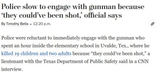 Stop telling me I’m supposed to blindly support cops no matter what. Stop pretending your Blue Lives Matter shit isn’t just a racist dogwhistle. This doesn’t happen when people become cops to protect and serve the public. This is what happens when people become cops so they can bully and harass people with impunity. These cowards aren’t going to risk their lives for anyone. This police force gets FORTY PERCENT of the city’s budget. This tiny town has a SWAT team. That wasn’t enough to save these children and their teachers.