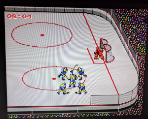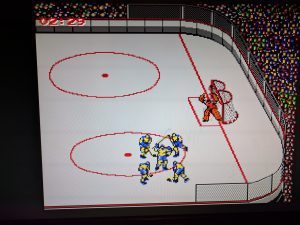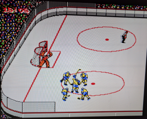 Energy in the arena was at a fever pitch. Something that sounded like a whistle joined some static that could be the cheering of the crowd, as the arena organist played a royalty-free, public domain chiptune. The Los Angeleses got ready for the face off, moving a couple of their guys around just before the referee announced “FACE OFF!” The Center Guy for Los Angeles won the puck, and skated back toward his own zone, before passing it at his own blue line to his goalie for some reason, even though he had a guy wide open at center ice. The Chicago Guy rushed toward the next, and fell down in the goal crease, allowing the goalie to pass it up ice. Two quick passes from One Guy to Another Guy Who Looks Just LIke Him got the puck into the Chicago zone, where This Guy fired a shot from the near boards that sailed past the goalie, to tie the score with just two minutes left.