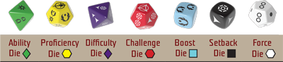 The core mechanic of the Age of Rebellion is the skill check. At times, the GM will have the characters roll pools of dice to determine whether their actions succeed or fail. Whenever you roll a skill check, you compare a pool of “positive dice” and their results against the results of a pool of “negative dice.” Positive dice help your character accomplish a task or achieve beneficial side effects. These dice may reflect his innate talents or abilities, special training, superior resources, or other advantages that he can apply to the specific task. Negative dice represent the forces that would hinder or disrupt him, such as the inherent difficulty of the task, obstacles, additional risks, or another character’s efforts to thwart the task.