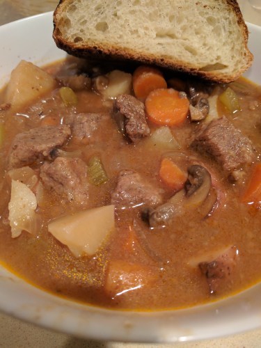 I thought about what she said, and then I thought about all the different recipes I’d looked at several weeks earlier. I realized that there were a few basic things that made stew … uh, stew, and that there’s no need to be precise when making it. You could just put all your Thanksgiving leftovers into a slow cooker, for instance, and turn them into a stew that’s perfect for eating with some crusty bread.