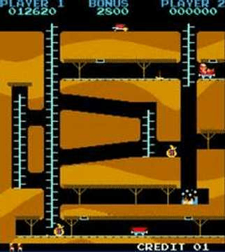 The game skipped the “are you ready” formalities of Donkey Kong and, like someone who had just escaped from jail, threw me into the middle of the action, on the run, bottom of the left screen at the base of a ladder. The music played! The little guard guy came lumbering across the top of the screen toward the top of the ladder, and I realized that I didn’t know where I was supposed to go. All the way to the right, along the bottom? All the way to the top? I guess? To escape? Like Dig Dug? Wait. I have to get the money! First you get the money, then you get the mojos, then you get the pizza. The world is yours.