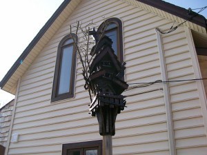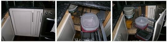 Zoom forward four months and he’s laying on the floor clutching his eye and seeking sympathy. Nope. Not unless there was blood spewing forth, which there wasn’t. Having been limping around myself for a month since I started shlepping boxes from the other house, I welcomed him to the Limping Club, poured a glass of wine and watched him limp back and forth taking cupboards down and putting cupboards up. I will say he redeemed himself in a major way when he produced the two glass cabinet doors for the wine glass cupboard. Working in stained glass myself, I was really, truly pleased with how marvellous the leaded windows turned out. They perfectly match the original leaded glass door that separates the kitchen from the rest of the house. It was taken down and moved to the garage to avoid any chance of accidental damage, so I haven’t seen them side by side yet, but the match is amazingly precise. So yeah, that cheered me up a bit. So did the nifty new garbage bin system he installed. It’s almost as cool as the newfangled lazy susan he put in the lower corner cupboard…you know the cupboard that is always four feet deep that you have to get on hands and knees and stretch your arms till your tongue hangs out in order to access the stuff at the very back? And even if you put a regular lazy susan in, it normally takes a hinged cupboard that opens halfway into the kitchen and you still have to crouch to your knees to spin it around and reach stuff. Well, he put in a newfangled gizmo that opens like a sliding drawer with two metal shelves, then it takes a turn to the right and pulls out further to bring a second set of shelves sliding forth. Farking amazing. Barely have to bend over and doesn’t take any more space than a regular cupboard door.