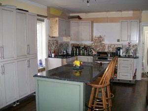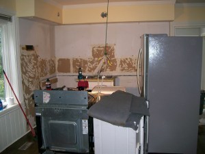 So now, amidst limping, drilling, shlepping, Kitchen Guy gives me the new timeline. He now has to make a new cupboard to replace the one he forgot to replace this time around. He is taking final measurements for the fan hood/cupboard, which he is building and promises it will be splendid. He took final measurements for the bathroom vanity and laundry storage unit, which he couldn’t do, in all generous honesty, until Bathroom Guy finished hooking up the washer and dryer and the shower went in. Dominoes again, I tell ya. He PROMISES to have all the cupboards and cupboard doors installed before I leave for Florida, but warned me that the crown moulding will not be done by then cuz that too is being hand made and needs to have all the cupboards in place before a final measurement can be taken. He has again promised splendor, so we’ll see. Even though it has taken most of my spare nerves waiting for all this to be done and finished, I will say the cupboards are splendid, and despite a snail’s ability to work faster, Kitchen Guy’s workmanship….when he gets the measurements right *snort*…is most excellent. Anyone else, I likely would have fired a month ago, but because I have faith in the end product, and because I know he would sob on my shoulder and “but…but…but…Mrs Canham” me to death, I shall trust the Kitchen Guy to come through with the promised splendor. It’s already more than halfway there, so I’ll share a few pics of the “before” and “during”.