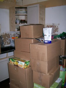 Today’s hopeful little mission is to move a couch out of the family room that is standing on it’s end because it doesn’t fit up the stairs to the TV room. The Clone is supposed to come get it, assuming his mother in law’s spouse kindly provides a truck capable of shlepping it the six blocks down the street. Going also is the island that used to be in the kitchen before it was gutted. My DIL spied it as it was being marked for demolition and threw her body across it, claiming it for a bar for their basement. Fine. They moved it out intact over a month ago and it’s been sitting in front of my garage draped in a bright blue tarp ever since. Gone. I want it gone. I already feel like I’m living in an episode of Hoarders with all the junk still lying around outside…although thanks to Number One Grandson, the mountain of empty boxes that was piled on the front deck was all shlepped down to the curb on recycle day. And I do mean a mountain. He made about ten trips hauling it all down, folding and stacking and packing the piles…pinning them down with sections of an old toilet. I’m not surprised that only one neighbour has ventured up the driveway to say hello. I’d be inclined to think Granny Clampett had moved into the ‘hood too.