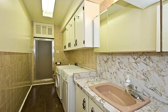 This was the original bathroom on the main floor. I liked to call it the bowling alley bathroom because it was long and narrow and had fixtures right out of a 50′s bowling alley, including the spiffy pink sink and terlet, with matching pink tiles and pink streaks in the genuine arborite countertops. The camera lens makes it look deceptively wide, unlike the exterior of the house which looks deceptively small, but believe me, there was just enough room to get my hips past the washer and dryer *snort*