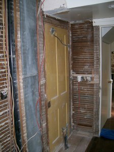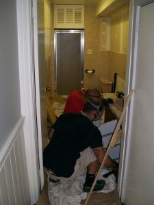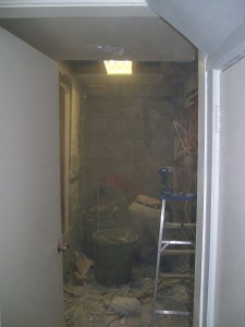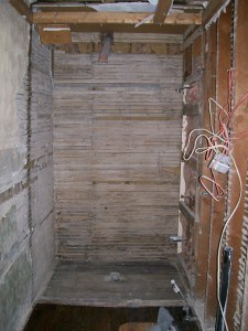 Here it is all gutted, bulkheads gone, closet shower gone and the wall opened up, ceiling raised about a foot and a half after taking out the goofy florescent fixture.