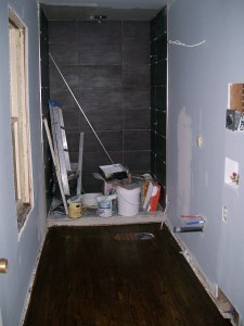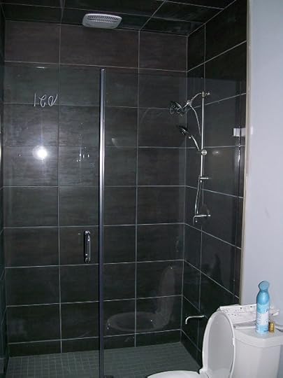 And today, with terlet in place, the glass doors installed. Still waiting on the vanity and lights and cabinets, but at least it’s functional and awful purdy *s*