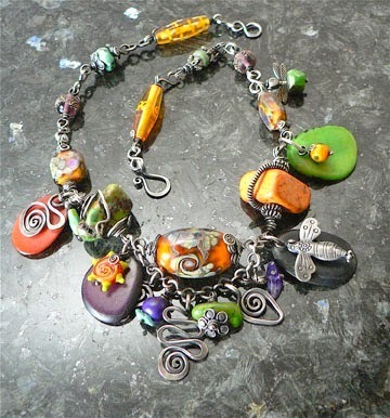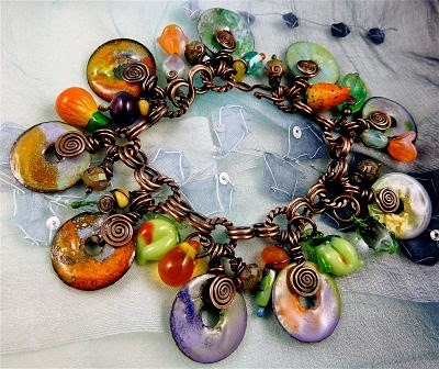 Pictured below, Donna's Metallo del Fiore bangle with luscious beads, textured metal, and wire that was first run through a tube wringer before it was coiled onto a 12-gauge bangle: