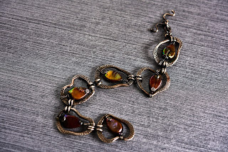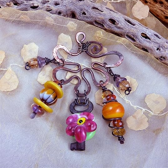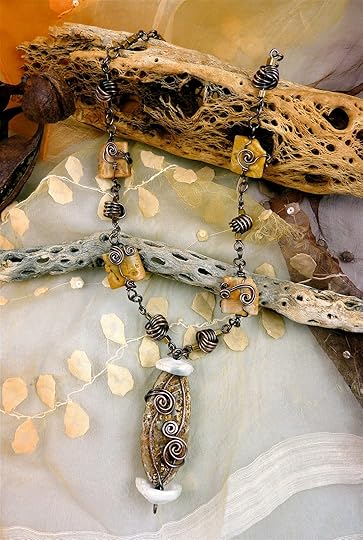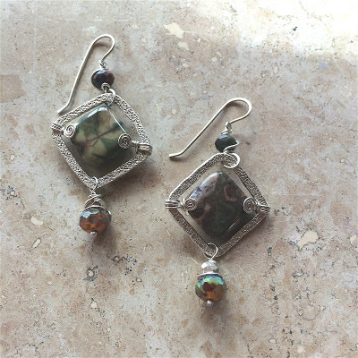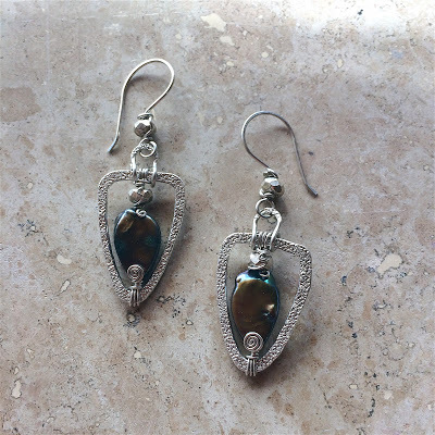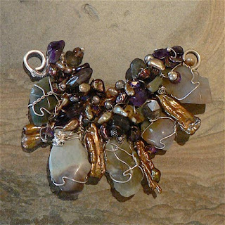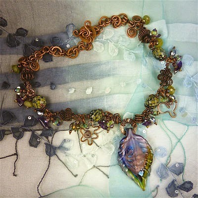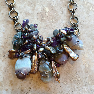 By contrast, the pendant shown above is quite pricey! I used sterling silver wire to create a forged and textured frame, and then several beautiful beads and pearls with fine-gauge sterling silver wire to embellish it. A simple handmade chain is very effective in this design, because it supports the pendant without overwhelming the design. I'm really happy with this particular necklace, and although a few people have offered to purchase it, I don't think it will ever be for sale.