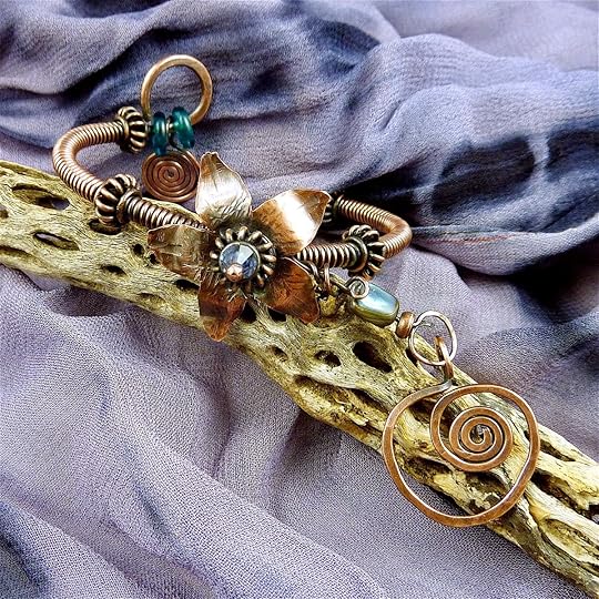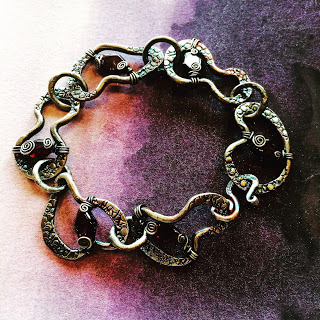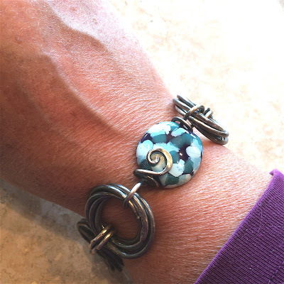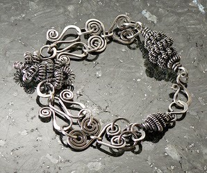 This bracelet was made using techniques that I teach in Lesson 1, Getting Started with Heavy-Gauge Wire, and Lesson 5, Getting Started with Fine Silver Fusing. You can do this! Yes, even if you're fairly new to working with wire. It helps to have some hand-strength when working with heavy-gauges of wire, but with practice you'll be able to manipulate it to your heart's content. I love wearing this bracelet; here's how it looks: