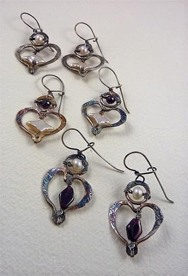 2. Starting early: As soon as you can begin, get going. Getting all your pieces made and packaged ahead of time will relieve a lot of your holiday stress. I start by making jewelry components first. For example, in the earrings pictured above, I made lots of large fine-silver fused rings and then shaped them into basic geometric shapes (squares & triangles), and then I forged and textured them. I later wrapped pearls and/or beads on them, and set them aside. Ear wires can always be added when you have time. I demonstrate making fine-silver components just like these in my online workshop, Big & Bold Wire Jewelry.