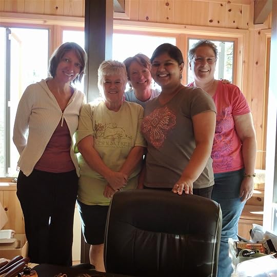 Pictured from left (above): Lisa, Joan, Donna, Amrita, and Mona. They're standing behind my "teacher's chair" on the first workshop day of the retreat (last Friday), looking fresh and happy and excited about the next three days to come! By the end of our weekend we were all completely exhausted, but pleased with our accomplishments.