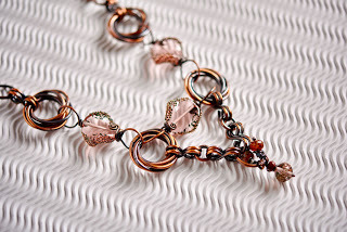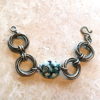 The ring clusters were then connected in a bracelet with large figure-8 links, a focal bead connector with wrapped loops, and a simple hook clasp.