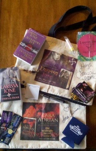 Note: Picture shows two totebags to show both sides of the totes. Prize is for ONE double-sided totebag autographed by both authors and is filled with items shown plus extras including signed copies of Lara Adrian's DEEPER THAN MIDNIGHT and KISS OF MIDNIGHT.