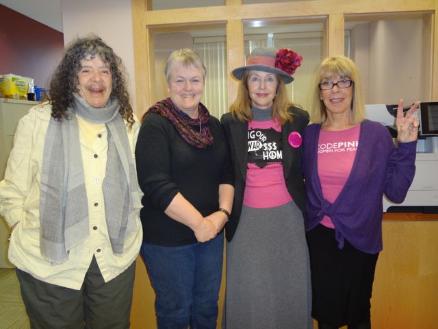 Codepink associates with Angus King’s senior policy advisor Marge Kilkelly in Augusta today.
