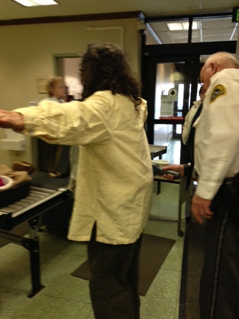 My friend Abby Shahn had to remove her belt, shoes, and get wanded by a metal detector.