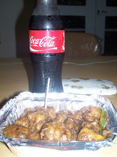 Veg Manchurian (deep fried vegetable balls) and a coke at my desk. Not exactly turkey and sweet potatoes, but it'll do.