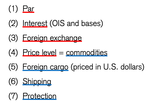 Finally, if the exchange of one type of money for another (the question of the par price) as conceptualized by Mehrling, is essentially a question of where one is located in the hierarchy of money types, then it makes sense to think of the “real” counterpart to par as the question of protection i.e. your relationship to power. In extremis, will your transaction be protected by a “gunboat” or, more likely, a drone, or not?
