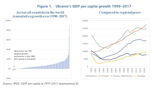 Ukraine’s performance between 1990 and 2017 was not just worse than its European neighbors. It was the fifth worst in the entire world. Between 1990 and 2017 there were all told only 18 countries with negative cumulative growth and even in that select group, Ukraine’s performance puts it in the bottom third. Amongst the four countries that delivered less growth for their citizens than Ukraine were the Democratic Republic of Congo, Burundi and Yemen.