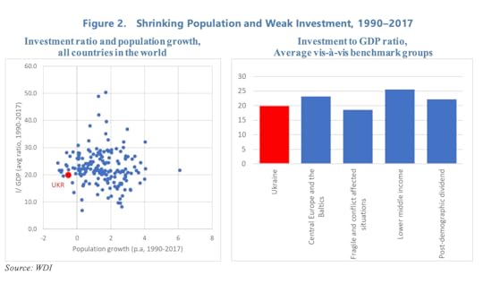 How do we explain this? The IMF authors point to Ukraine’s uniquely unpromising combination of low investment and declining population.