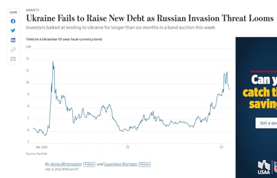 In the mean time the economic and financial situation in Ukraine is deteriorating. Not only are dollar-denominated bonds selling off and CDS-default protection surging, but at the beginning of February a local-currency public debt issue failed. No one wanted debt to be repaid one to two years from now.