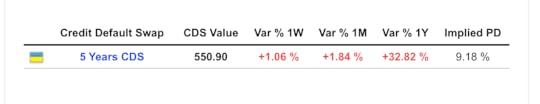 Credit Default Swap insurance on Ukraine’s debt stand at 550 i.e. you pay 5.5% on top of any interest to insure debt. That is bad. It makes new borrowing unaffordable. But it is not yet apocalyptic. Let us hope the markets are right.