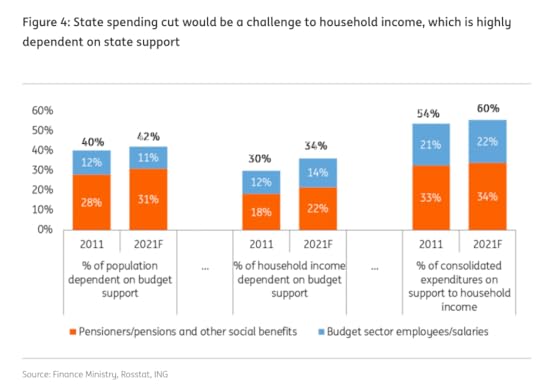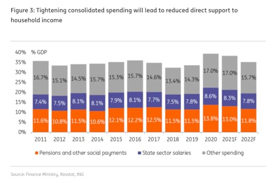 In part, my speculation about unchaining a Keynesian/MMT response to the shock in Russia was driven by reading Dmitry Dolgin’s analysis of the Russian economy at ING. His analysis often draws on rather interesting data on the share of Russian budget and household incomes that derives form state sources.